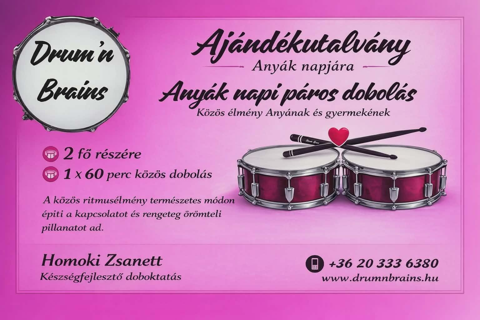 Az utalvány felhasználható egyéni és páros fejlesztő dobórákra, valamint élménydobolásra. A foglalkozások minden résztvevő számára személyre szabottak, így a gyermekek, kezdők és felnőttek egyaránt élvezhetik a játékos, mégis tudatosan felépített órákat. A zene segítségével fejlődik a figyelem, a ritmusérzék, a mozgáskoordináció, az önbizalom, és közben a stressz is oldódik.